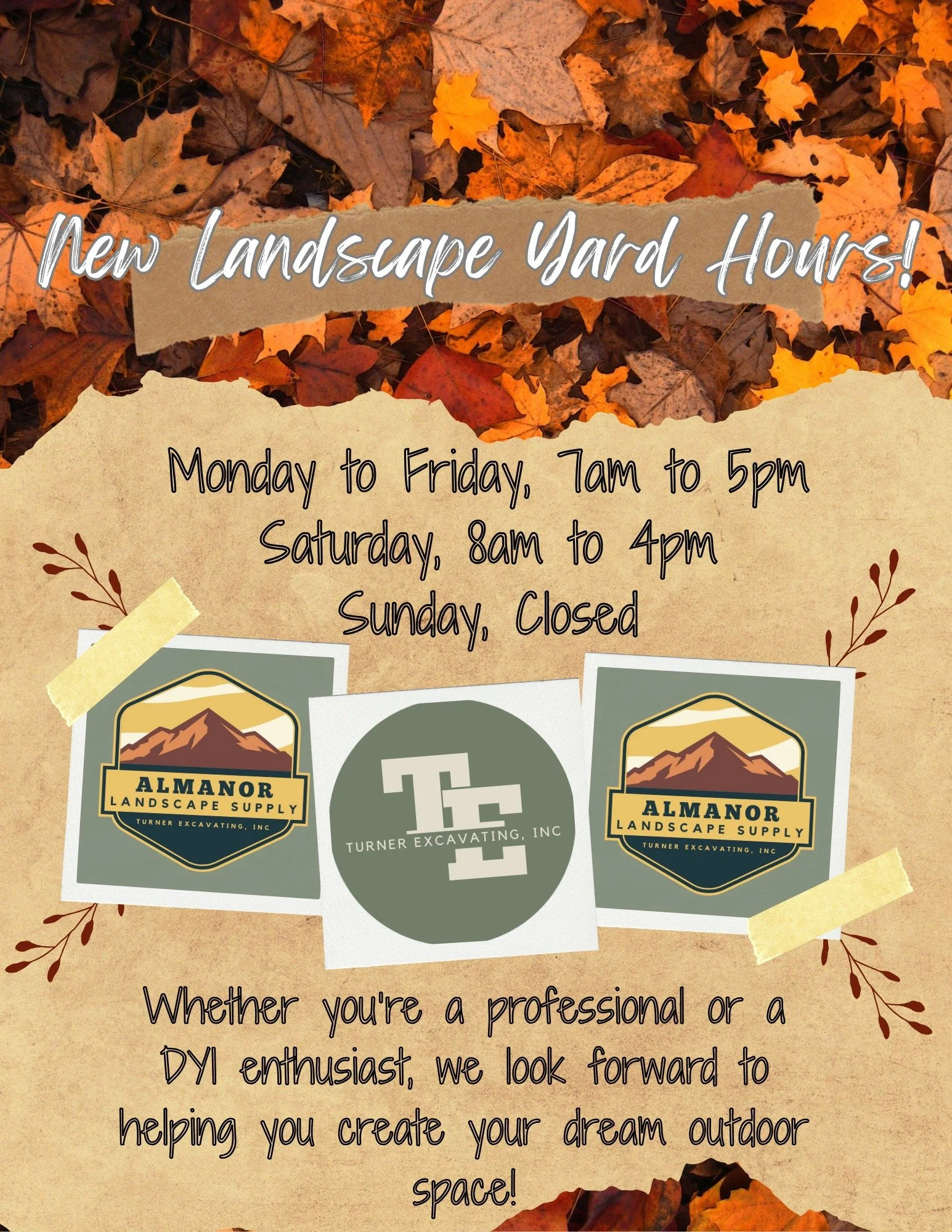 Almanor Landscape Supply Hours: Monday - Friday 7:00AM - 5:00PM, Saturday 8:00AM-4:00PM, Sunday 9AM-NOON Office Hours: Monday - Friday 8:00AM - 5:00PM